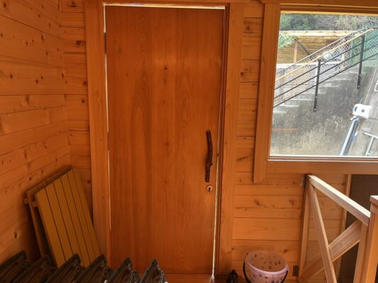 大分県日田産の檜の厚みは8.5cmでサウナ内に檜の香りが充満し森の中にいるみたいにリラックス出来ます。