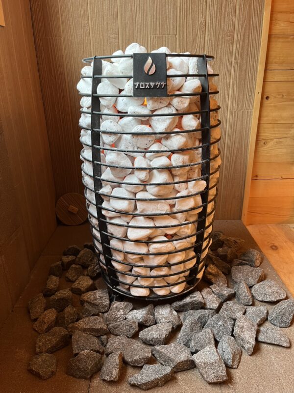 サウナストーンにほうじ茶やアロマ水をかけてロウリュを楽しめます。